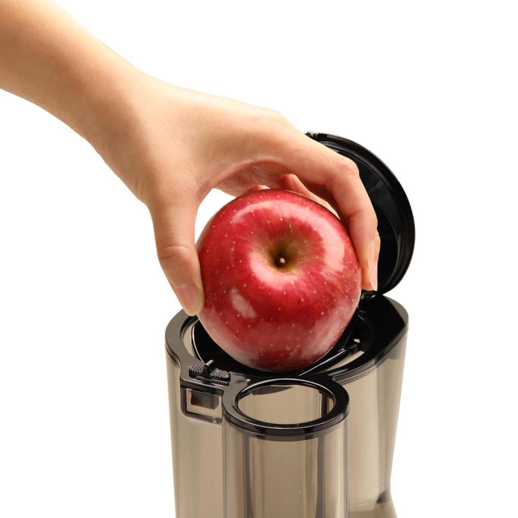 - Den selvskærende snegl inde i juicekammeret stjæler og knuser automatisk de indsatte råvarer, hvilket i høj grad forenkler håndteringen og forkorter tilberedningen af frisk juice.