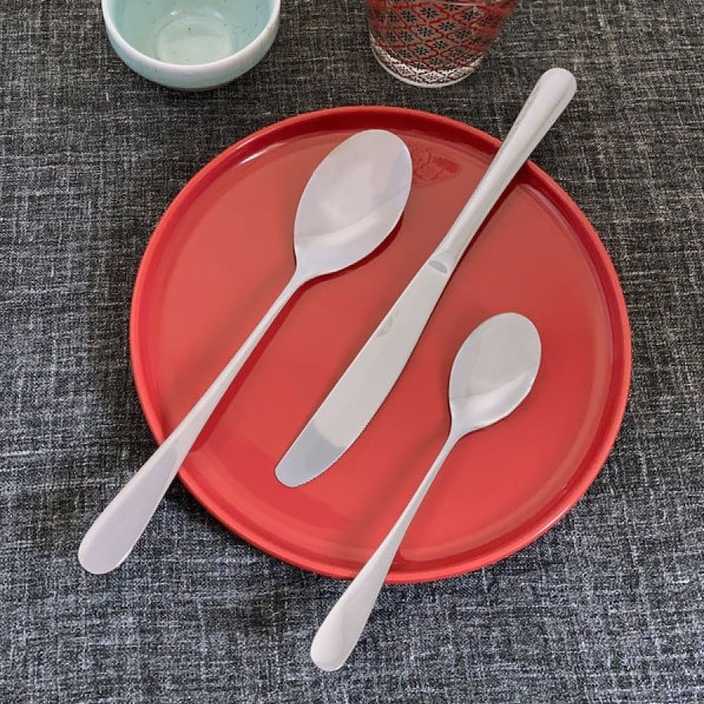 - sættet indeholder i alt 24 dele: 6 bordknive, 6 gafler, 6 suppeskeer og 6 teskeer