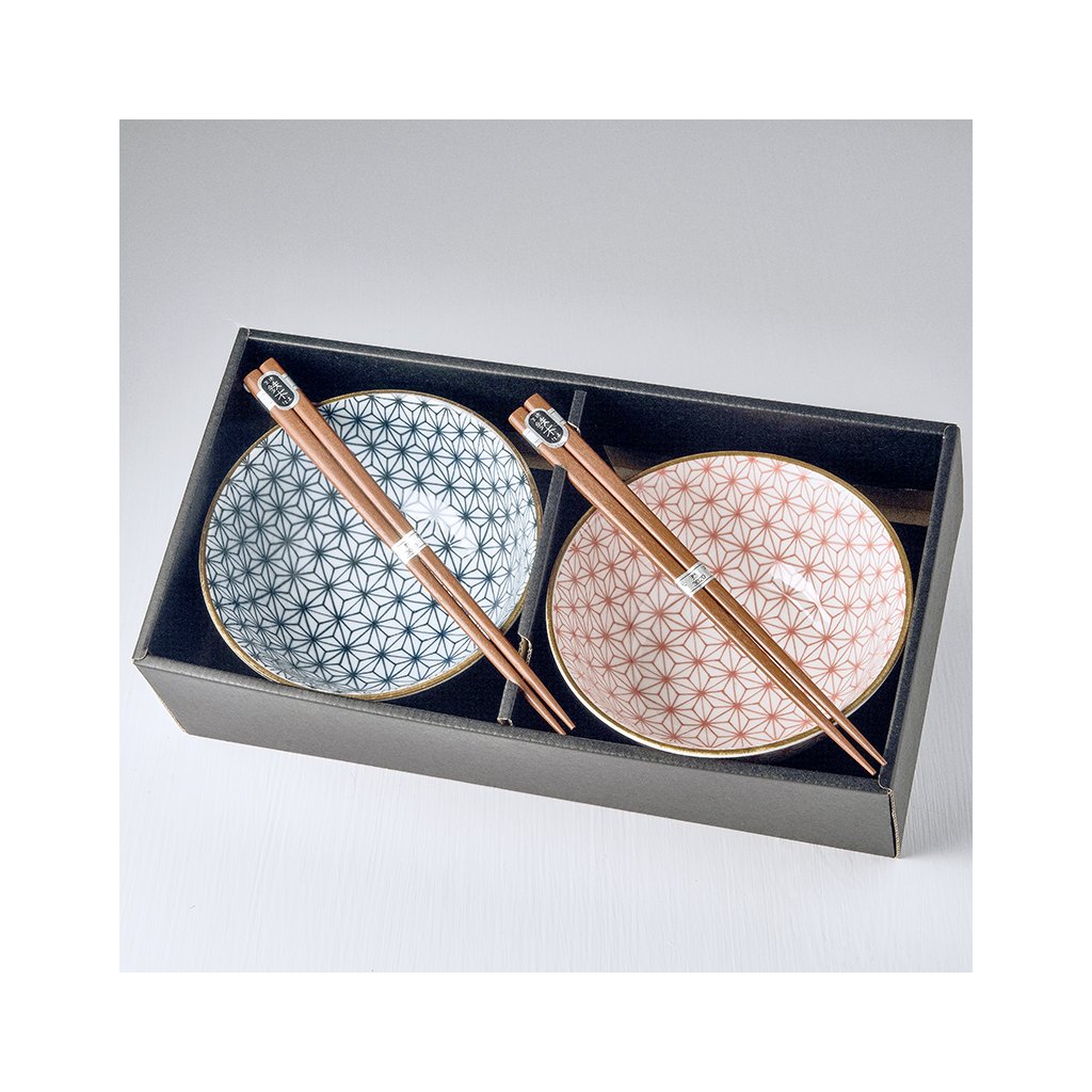 Sættet indeholder 2 skåle i blå og rød samt 2 spisepinde i træ. Hver skål har det samme geometriske motiv og en guldkant. Dette sæt leveres i en elegant sort gaveæske og er derfor velegnet som gave til venner eller forretningspartnere.