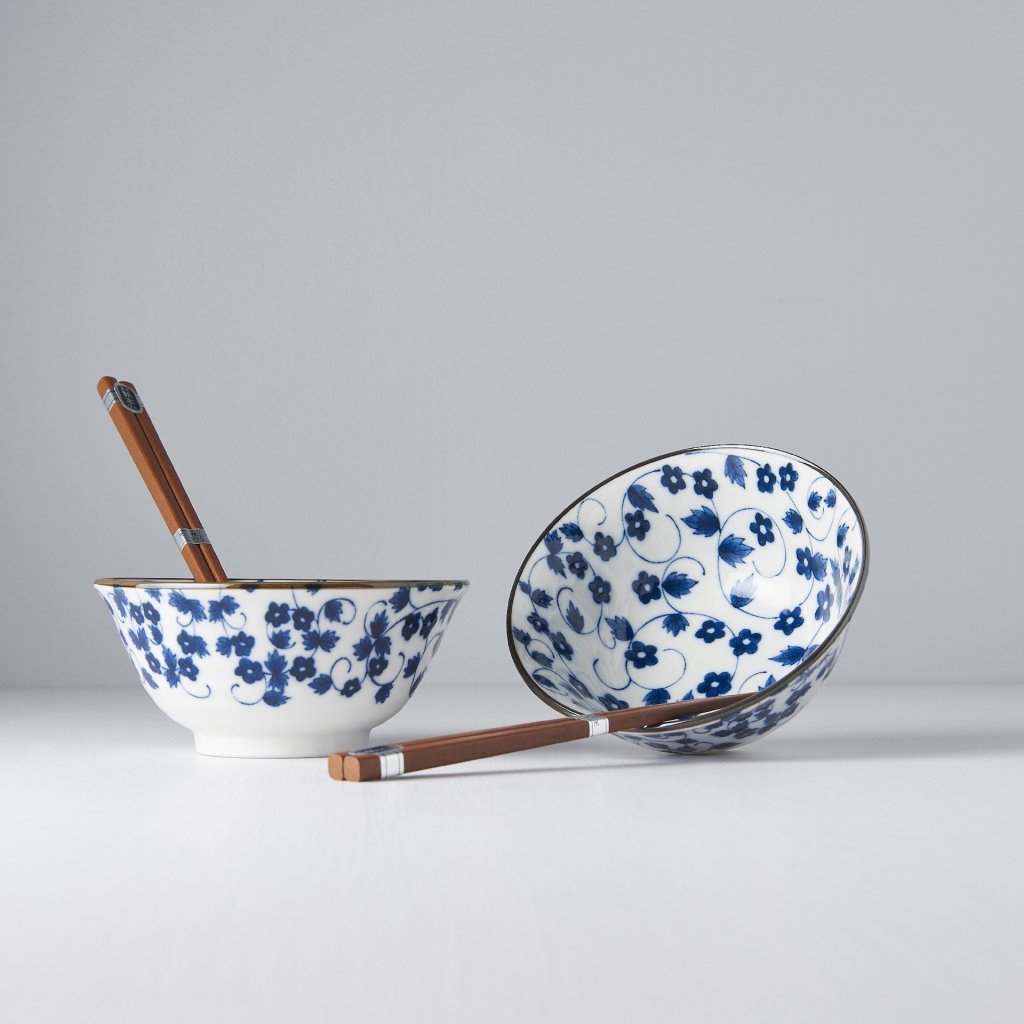 Sættet indeholder 2 par spisepinde i træ og 2 skåle i hvid med håndmalede blomster i blå. Dette sæt leveres i en elegant sort gaveæske og er derfor velegnet som gave til venner eller forretningspartnere.