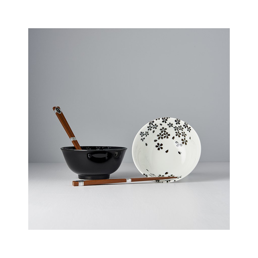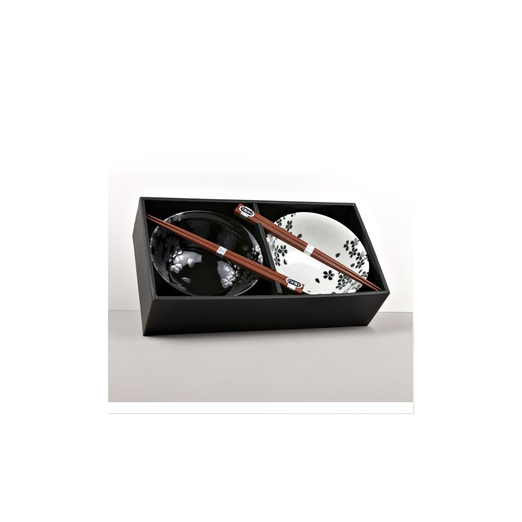 Sættet indeholder 2 par spisepinde i træ og 2 skåle i sort og hvid med håndmalede grå skurvblomster. Dette sæt leveres i en elegant sort gaveæske og er derfor velegnet som gave til venner eller forretningspartnere.