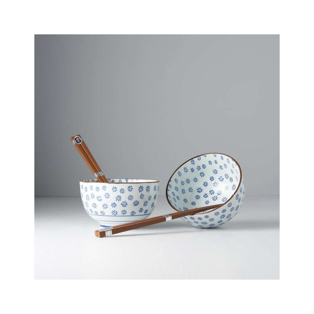 Sættet indeholder 2 par spisepinde i træ og 2 skåle i hvid med et blåt snefnugmotiv. Skålene er omkranset af en guldlinje. Dette sæt leveres i en elegant sort gaveæske og er derfor velegnet som gave til venner eller forretningspartnere.