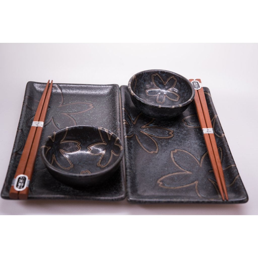 Tallerkener og skåle er i sort med blomstermotiv. Brug sættet til servering af sushi med saucer, men du kan også bruge skålene til sake. Dette sæt leveres i en sort gaveæske og er derfor velegnet som gave.