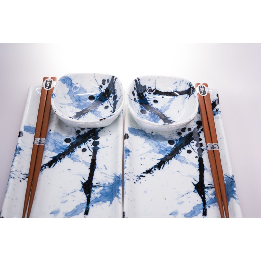 Tallerkener og skåle er hvide med lyseblå og mørkeblå dekorationer som en stænkeffekt. Brug sættet til servering af sushi med saucer, men du kan også bruge skålene til sake. Dette sæt leveres i en sort gaveæske og er derfor velegnet som gave.