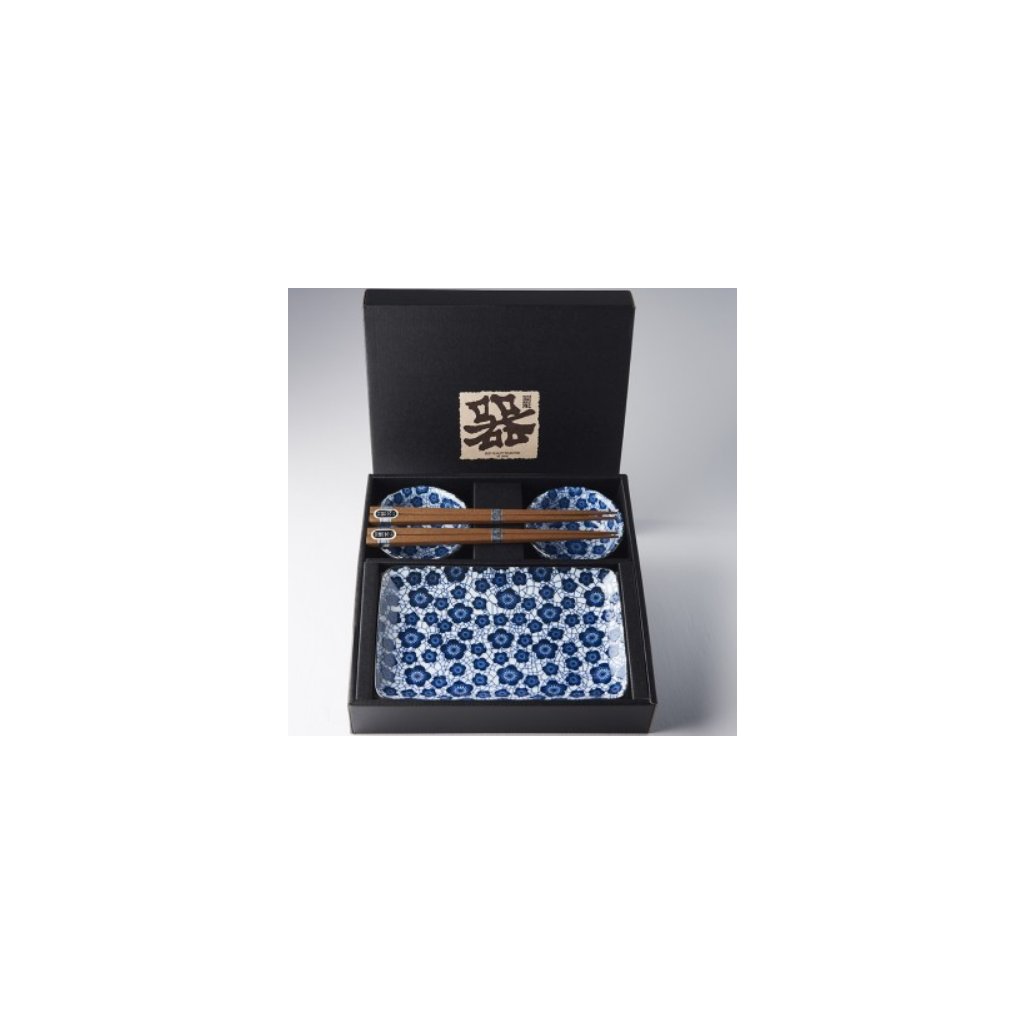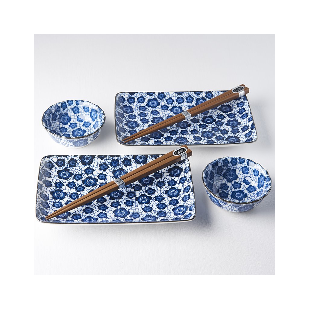 Tallerkener og skåle er hvide med blå kronblade. Brug sættet til servering af sushi med saucer, men du kan også bruge skålene til sake. Dette sæt leveres i en sort gaveæske og er derfor velegnet som gave.