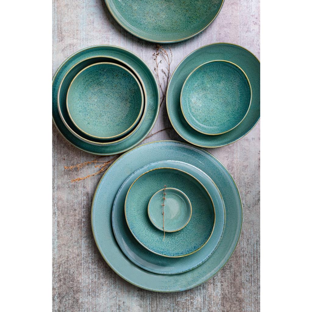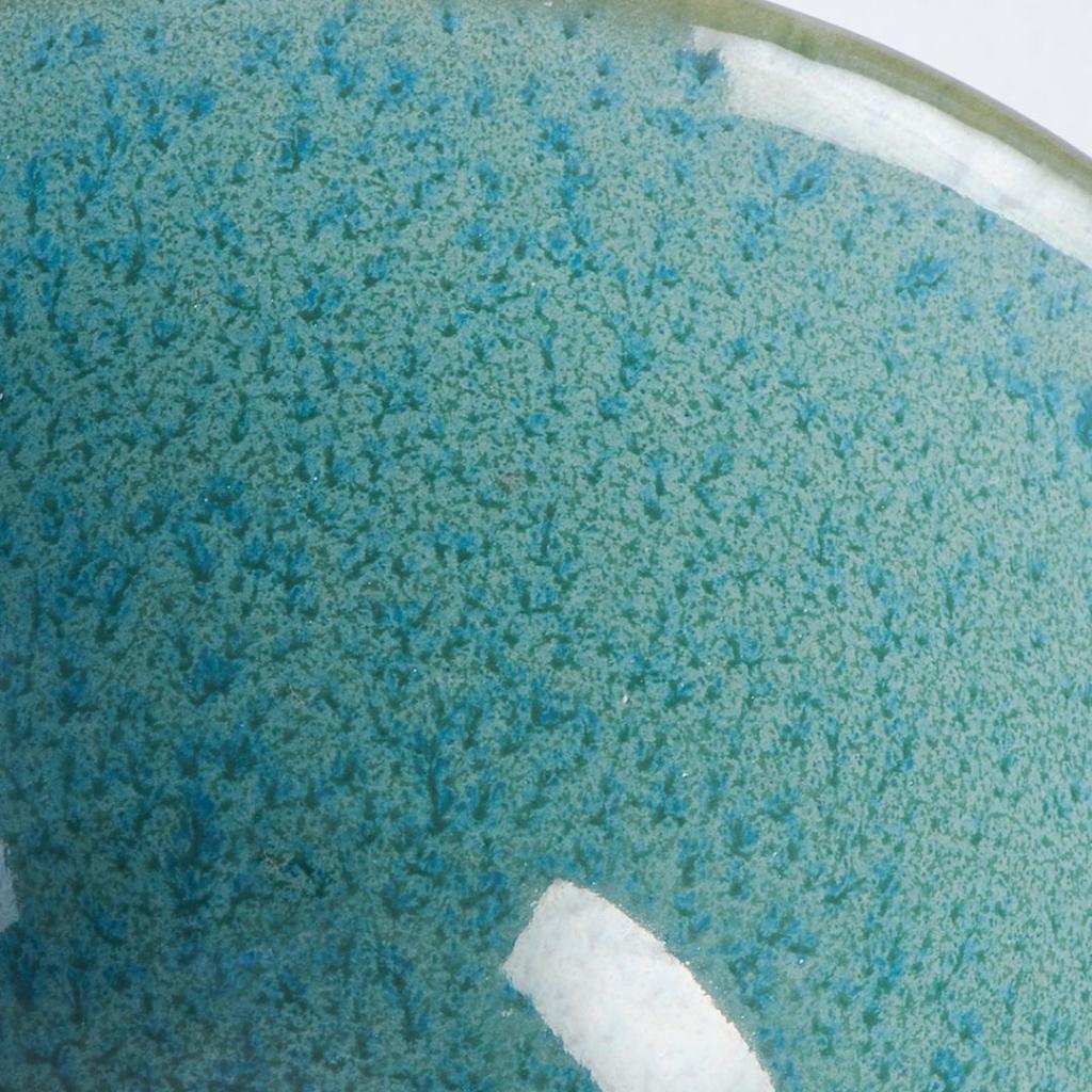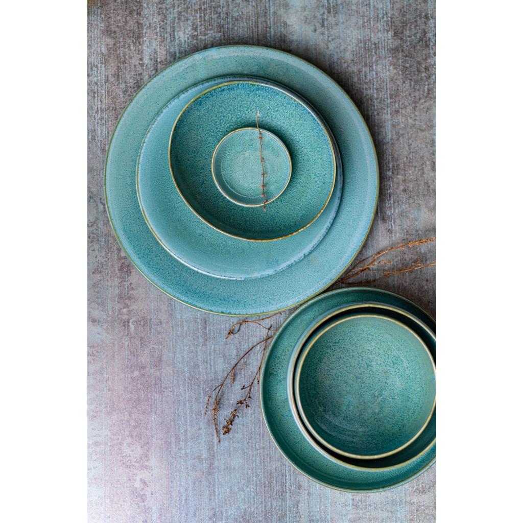 I denne pakke finder du en teskål med en diameter på 9 cm uden hank fra Peacock-kollektionen . Den blanke skål har en grønblå farve og en gylden linje på kanten.