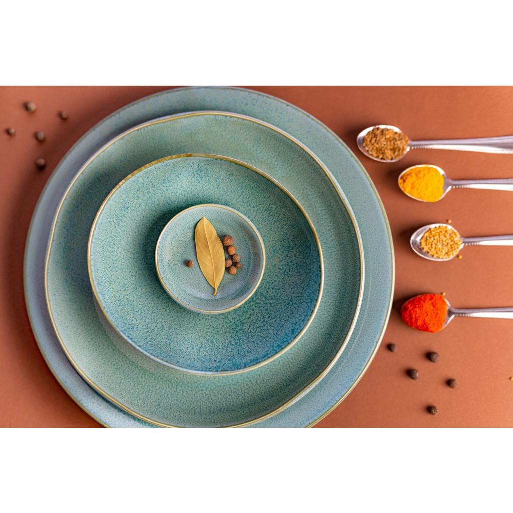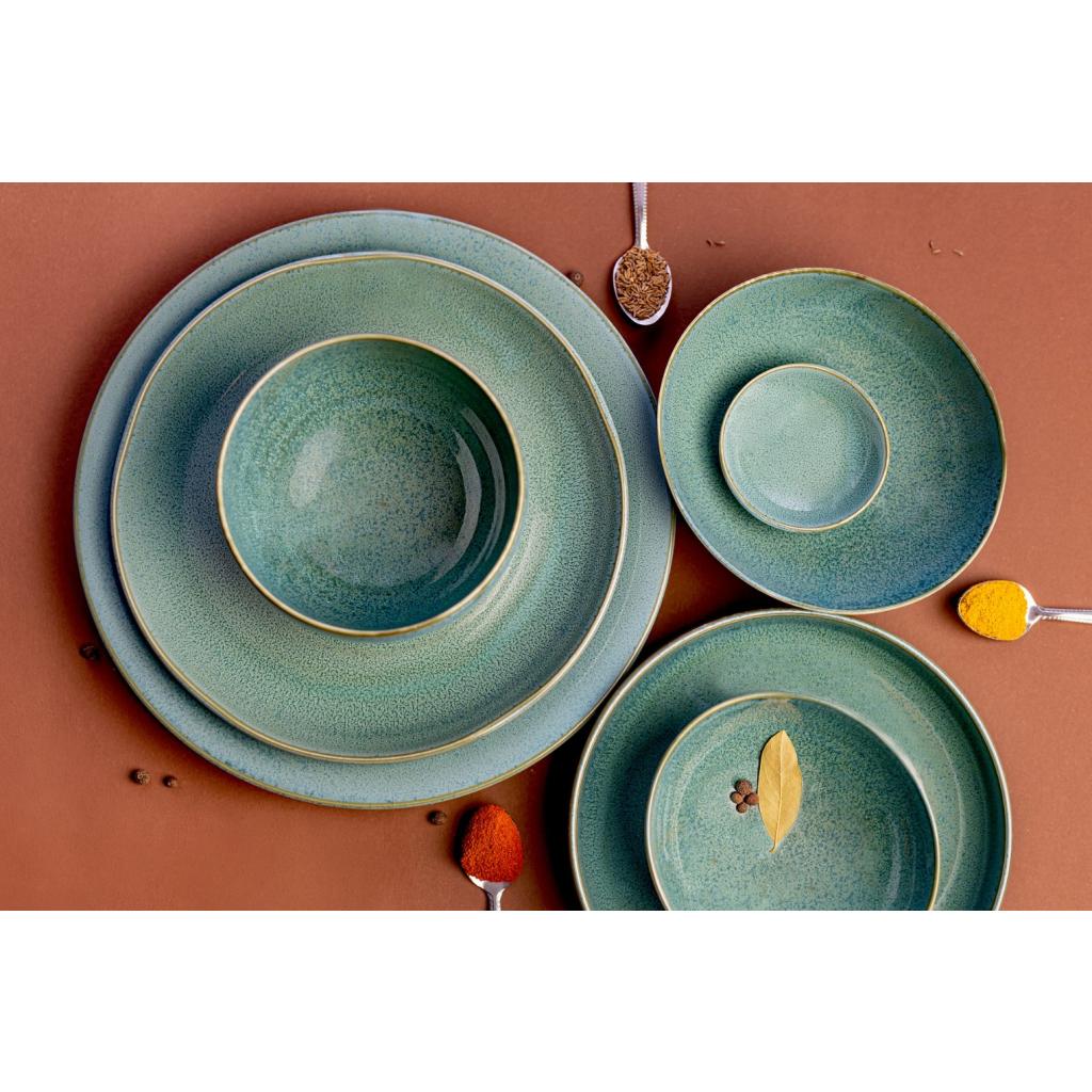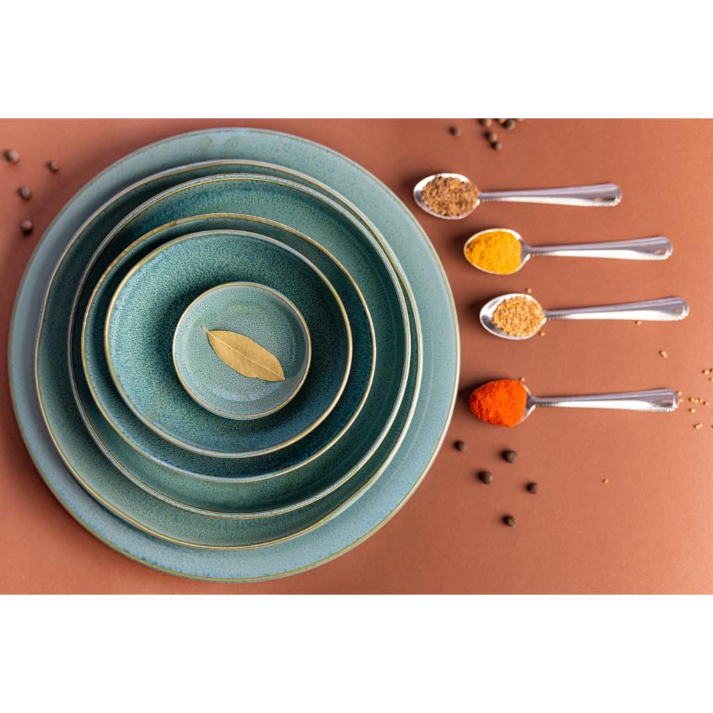 I denne pakke finder du en teskål med en diameter på 9 cm uden hank fra Peacock-kollektionen . Den blanke skål har en grønblå farve og en gylden linje på kanten.