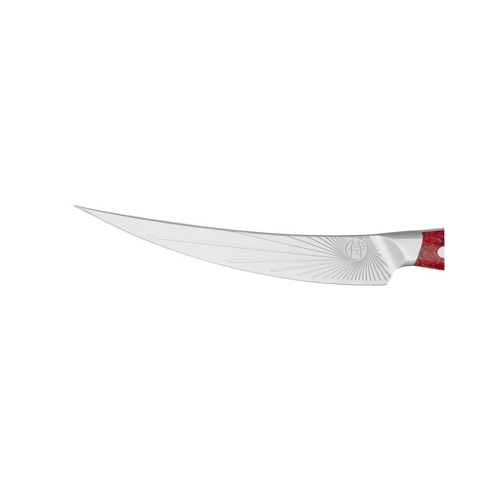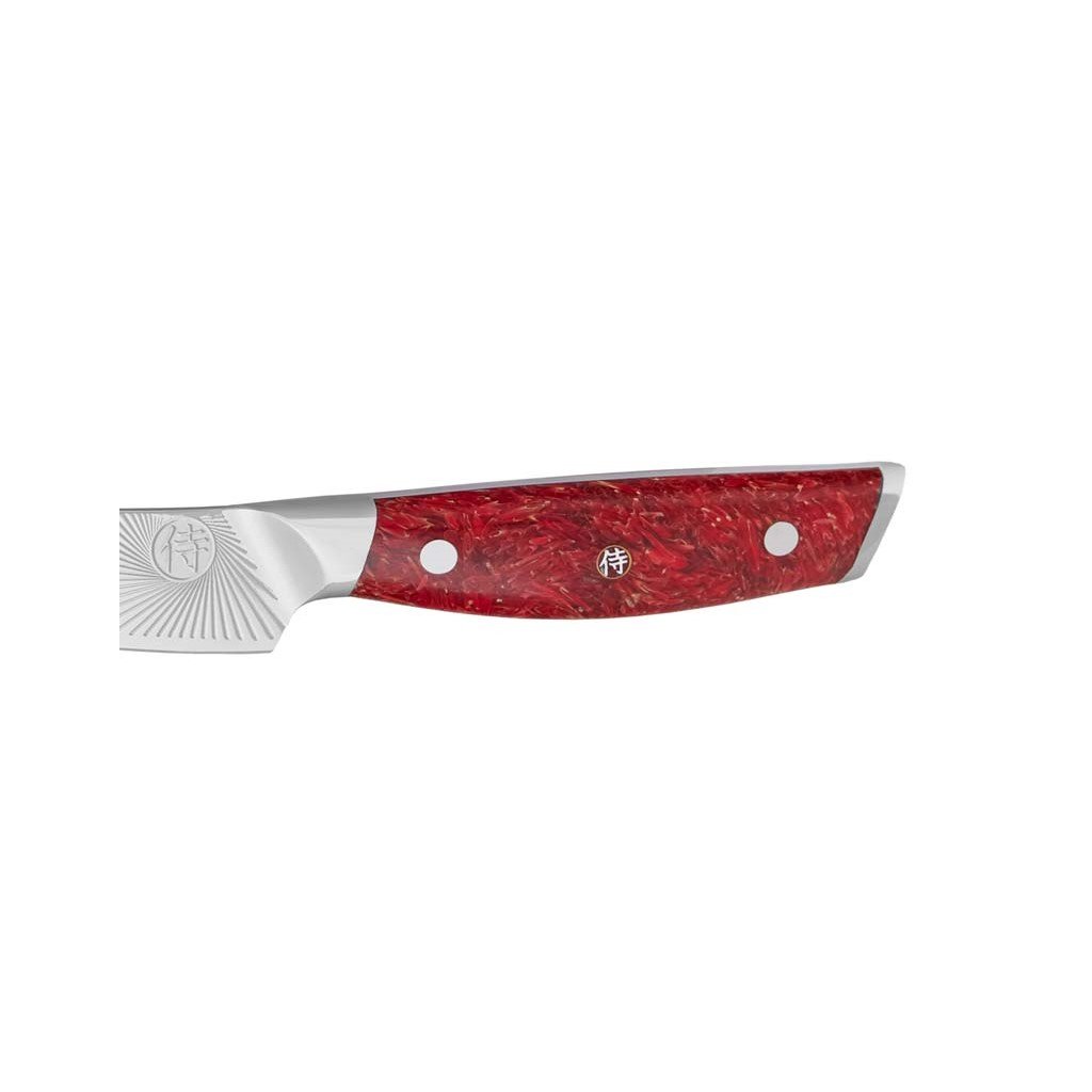 - ekstraordinært design - håndtag lavet af riskorn dækket af rød epoxyharpiks med japansk samurai-emblem