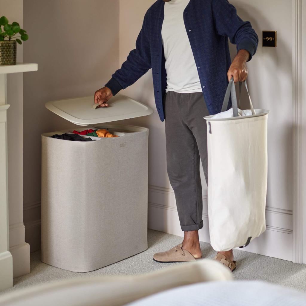 - Aftagelige tekstilposer med faste håndtag gør det nemt at transportere vasketøjet direkte til vaskemaskinen uden at skulle håndtere hele beholderen.