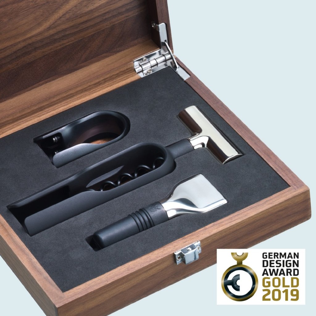 Luksussættet til vinelskere er den ideelle gave til dem, der sætter pris på kvalitet og har smag. De vellavede instrumenter opbevares i en elegant trækasse. At servere god vin ordentligt er altid et ritual.