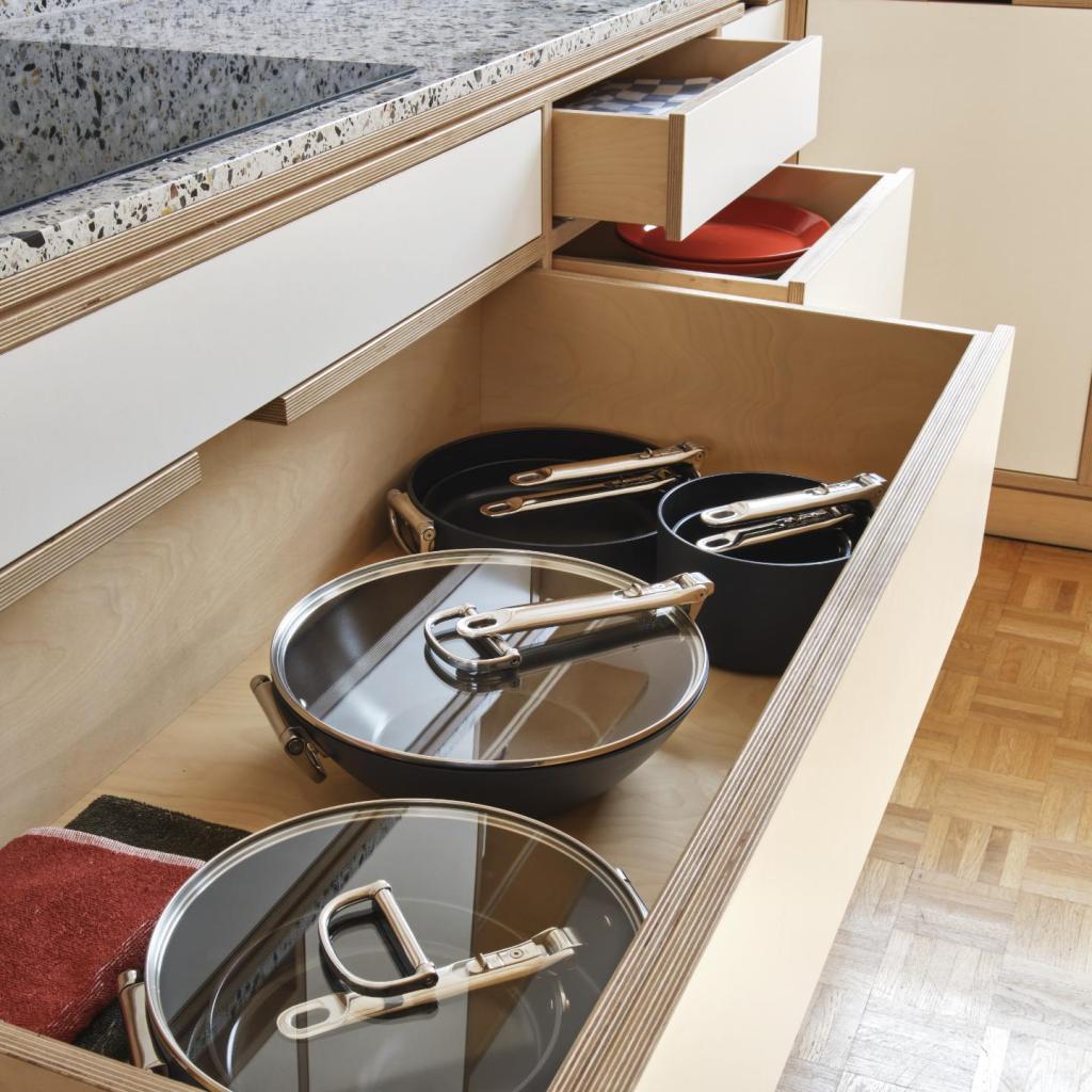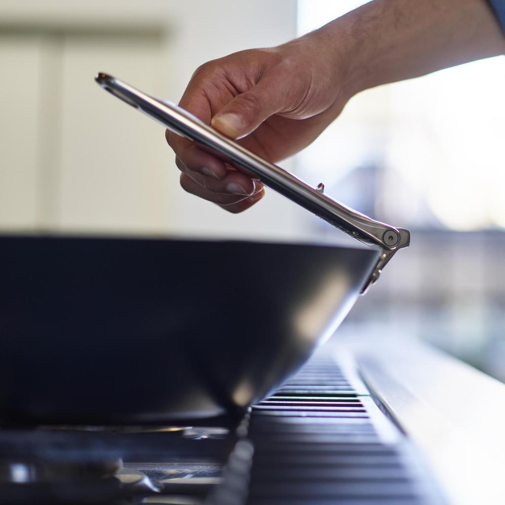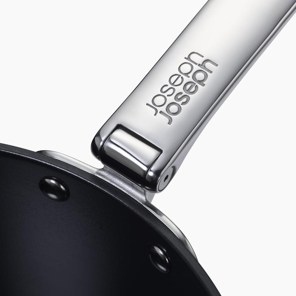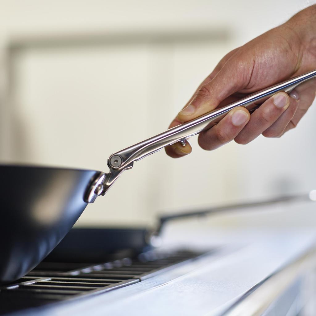 - Takket være foldemekanismen kan håndtaget nemt foldes langs pandens krop, hvilket sparer op til halvtreds procent plads sammenlignet med almindeligt køkkengrej.