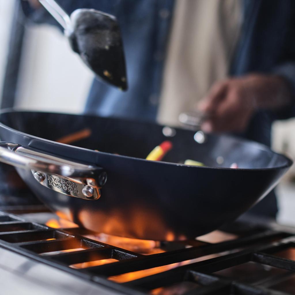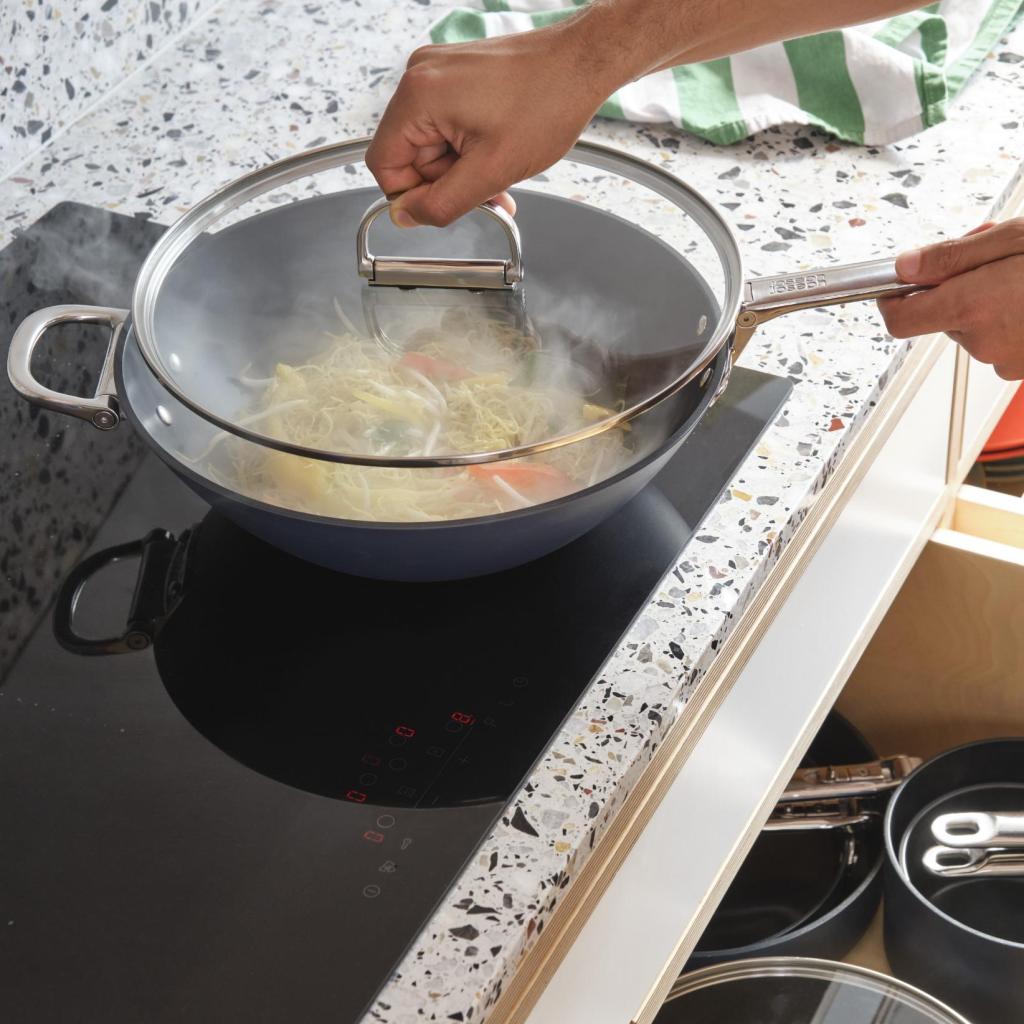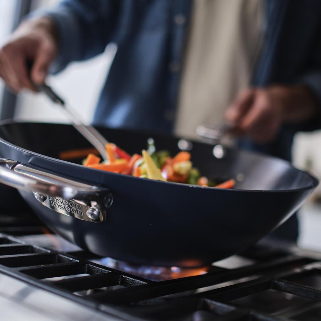 - Wok Joseph Joseph SPACE med låg er designet til intensiv sautering, stegning, kogning og stuvning af store mængder mad med vægt på at spare opbevaringsplads.